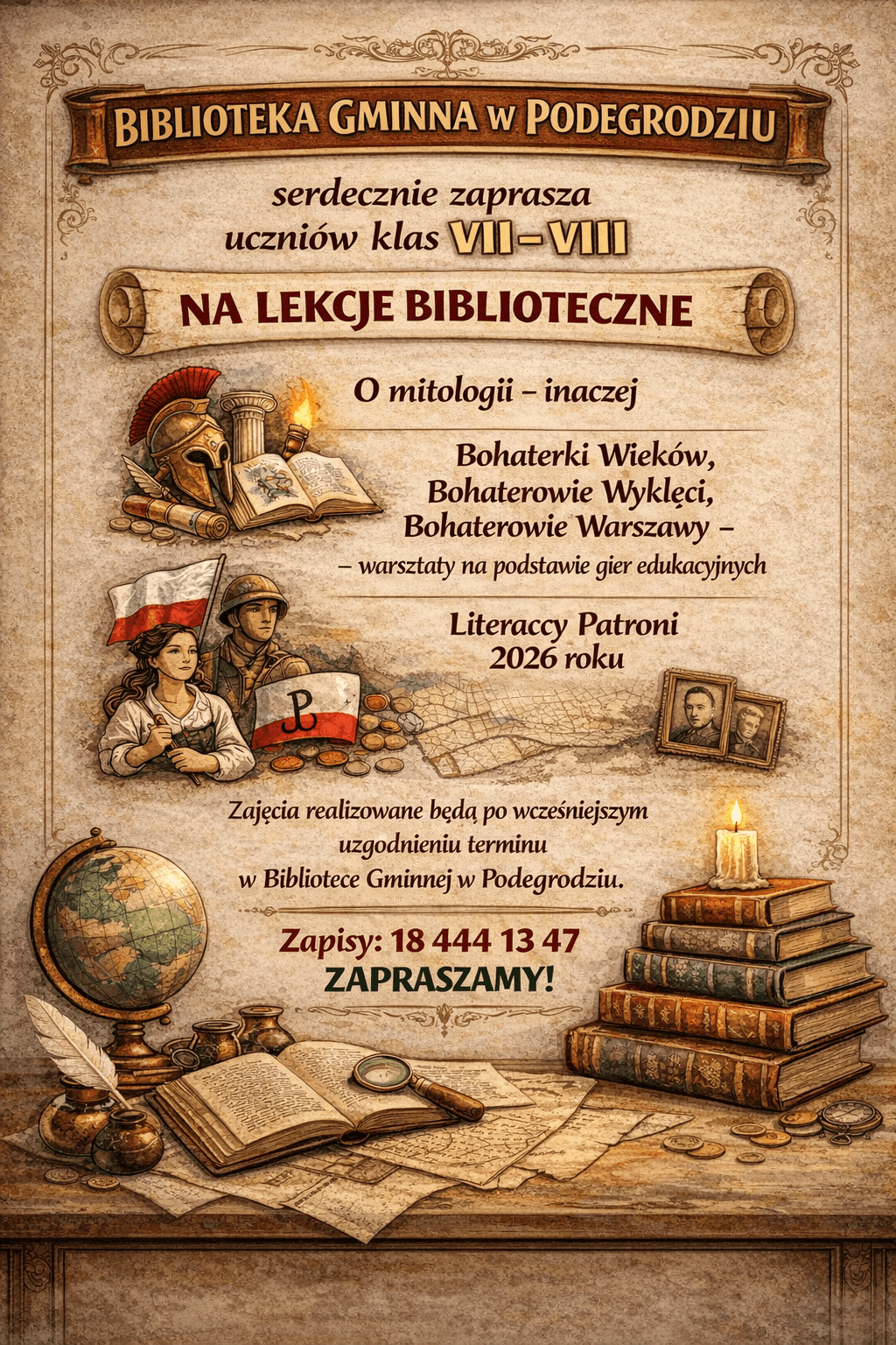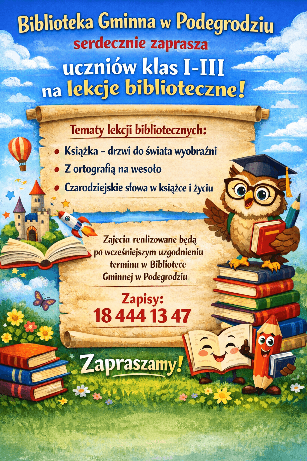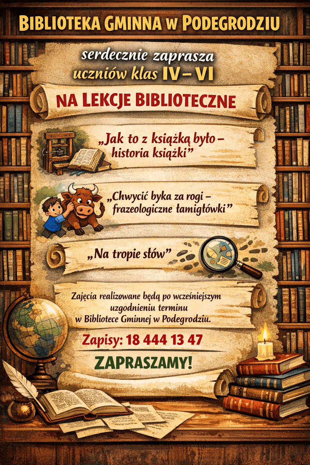 Biblioteka Gminna w Podegrodziu zaprasza uczniów klas od I do VIII na lekcje biblioteczne.