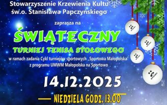 Stowarzyszenie Krzewienia Kultu św. o. Stanisława Papczyńskiego po raz kolejny zaprasza wszystkich miłośników sportu na Świąteczny Turniej Tenisa Stołowego, organizowany w ramach zadania „Cykl turniejów sportowych Sportowa Małopolska” z programu UMWM Małopolska na Sportowo. Sportowe wydarzenie odbędzie się w...