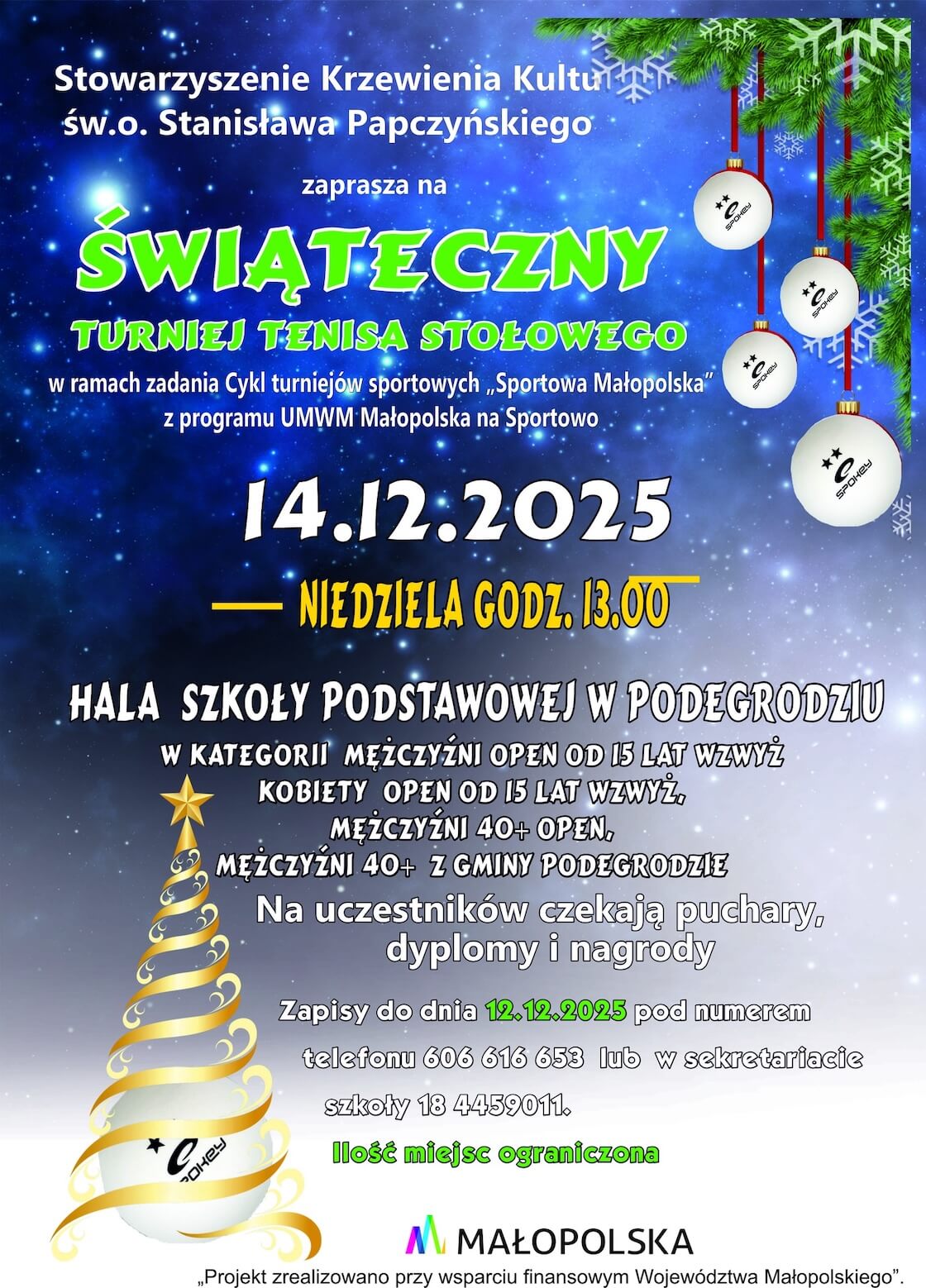 Stowarzyszenie Krzewienia Kultu św. o. Stanisława Papczyńskiego po raz kolejny zaprasza wszystkich miłośników sportu na Świąteczny Turniej Tenisa Stołowego, organizowany w ramach zadania „Cykl turniejów sportowych Sportowa Małopolska” z programu UMWM Małopolska na Sportowo.