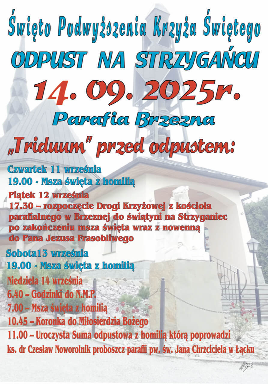 Uroczystości odpustowe poprzedzi Triduum. Msze Święte z homilią będą sprawowane w czwartek (11.09) o 19.00 oraz w sobotę (13.09) o 19.00. W piątek (12.09) o 17.30 rozpocznie się Droga Krzyżowa z kościoła parafialnego w Brzeznej na Strzyganiec, gdzie odprawiona zostanie Msza Święta.